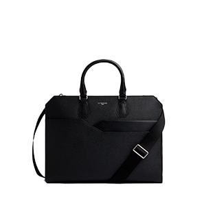 Porte-documents avec poignées rigides et détails finition argent. Bandes ajustées piquées en T, signature de la Maison. Portez-le à la main, à l’épaule ou croisé avec sa bandoulière ajustable amovible. Peut accueillir un ordinateur portable 17".