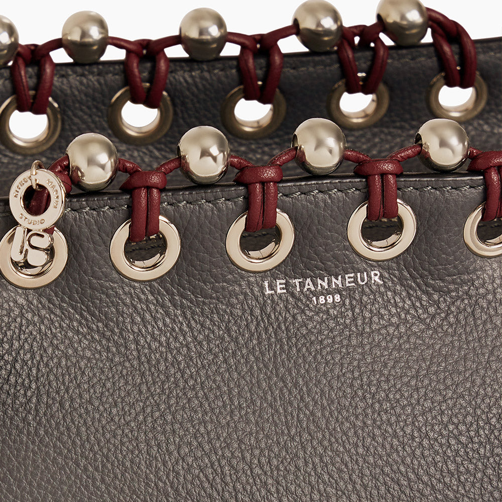 Je suis arrivée dans la bijouterie par le design textile. Je travaille donc le bijou d’une manière différente d’un artisan joaillier ou un designer spécialisé. Avec Le Tanneur, l’idée était de créer un sac-bijou en partant du sac Louise. Nous avons intégré à notre tressage des perles métalliques, posé des œillets pour un effet « bijou ».
