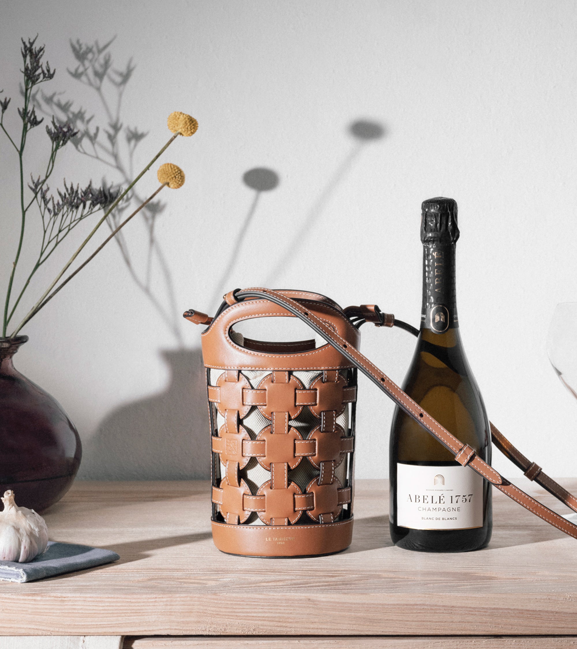 Mêlant cuir et toile de coton, ce sac numéroté et en édition limitée met à l’honneur la technique du tressage et offre ainsi une silhouette structurée, élégante, rehaussée par l’utilisation d’un cuir lisse qui confère douceur et souplesse.  La couleur marron tan représente ici la signature Le Tanneur, tout comme les arches Abelé gravées dans le cuir de vachette pleine fleur. Quant à la bouteille glissée à l’intérieur : un Blanc de Blancs, la cuvée phare de la Maison Abelé 1757.