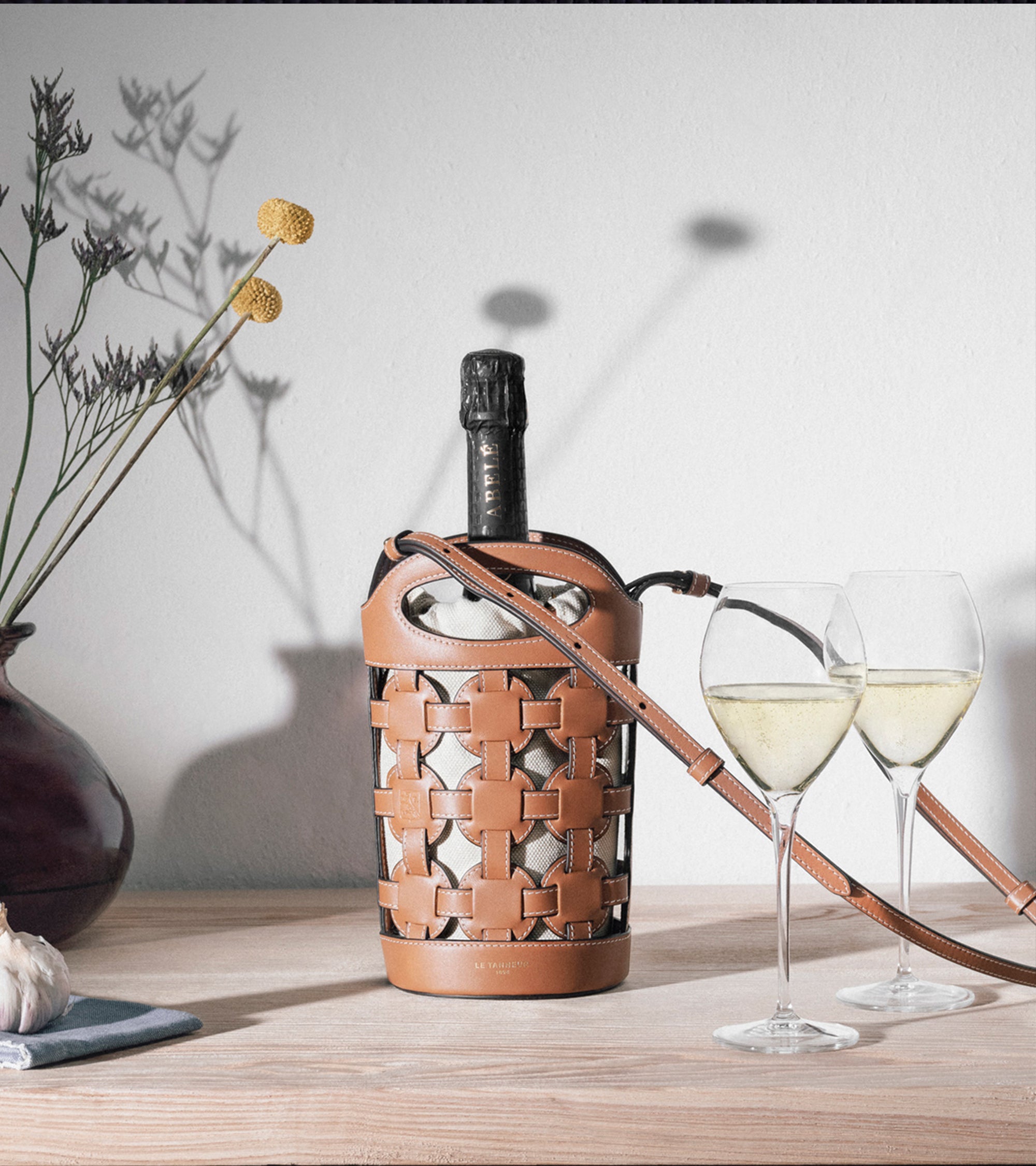 Les deux se sont retrouvées pour une collaboration unique en son genre : un sac porte-bouteille en cuir tressé, pensé pour emporter les fines bulles d’un Blanc de blancs.