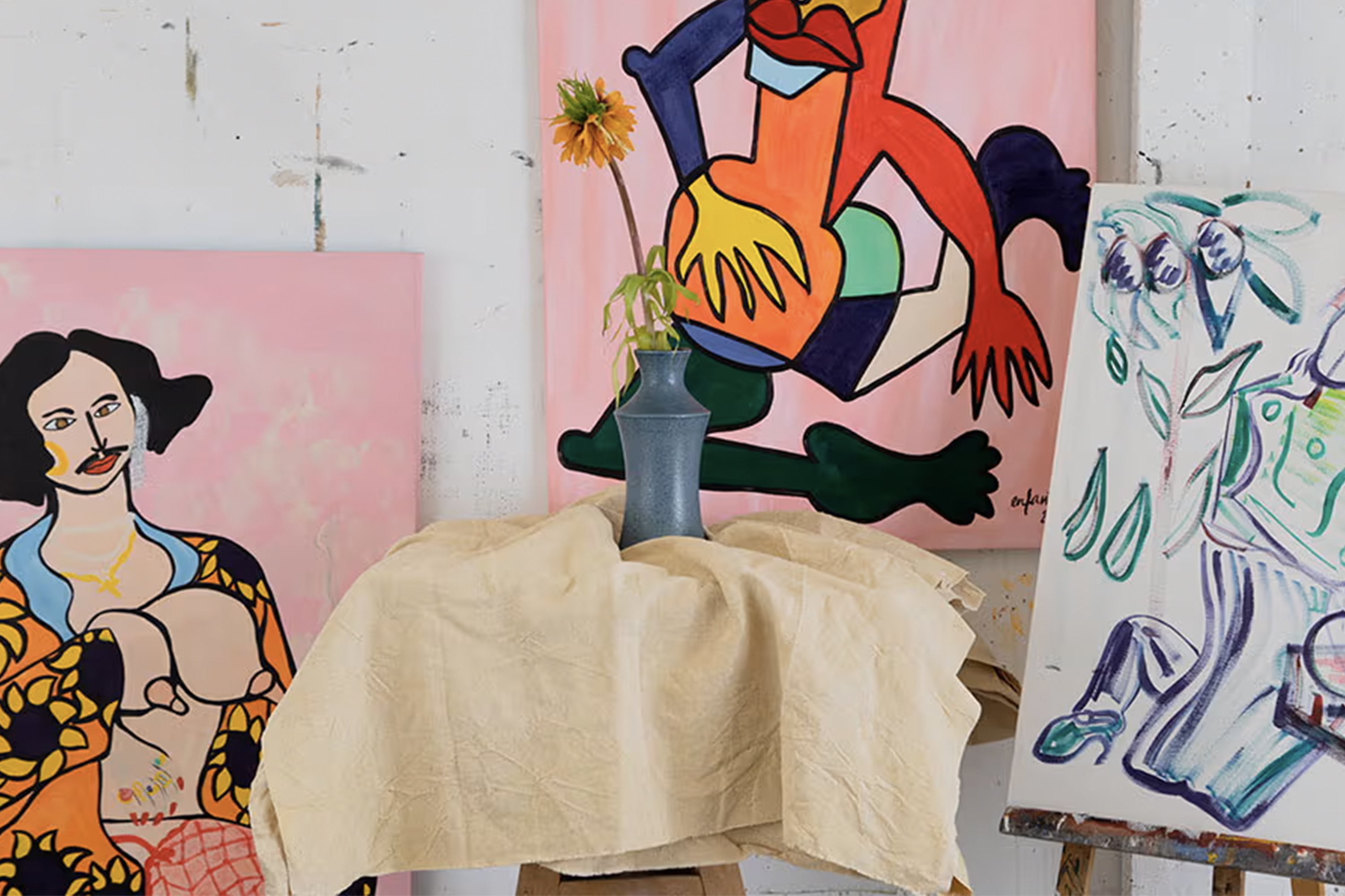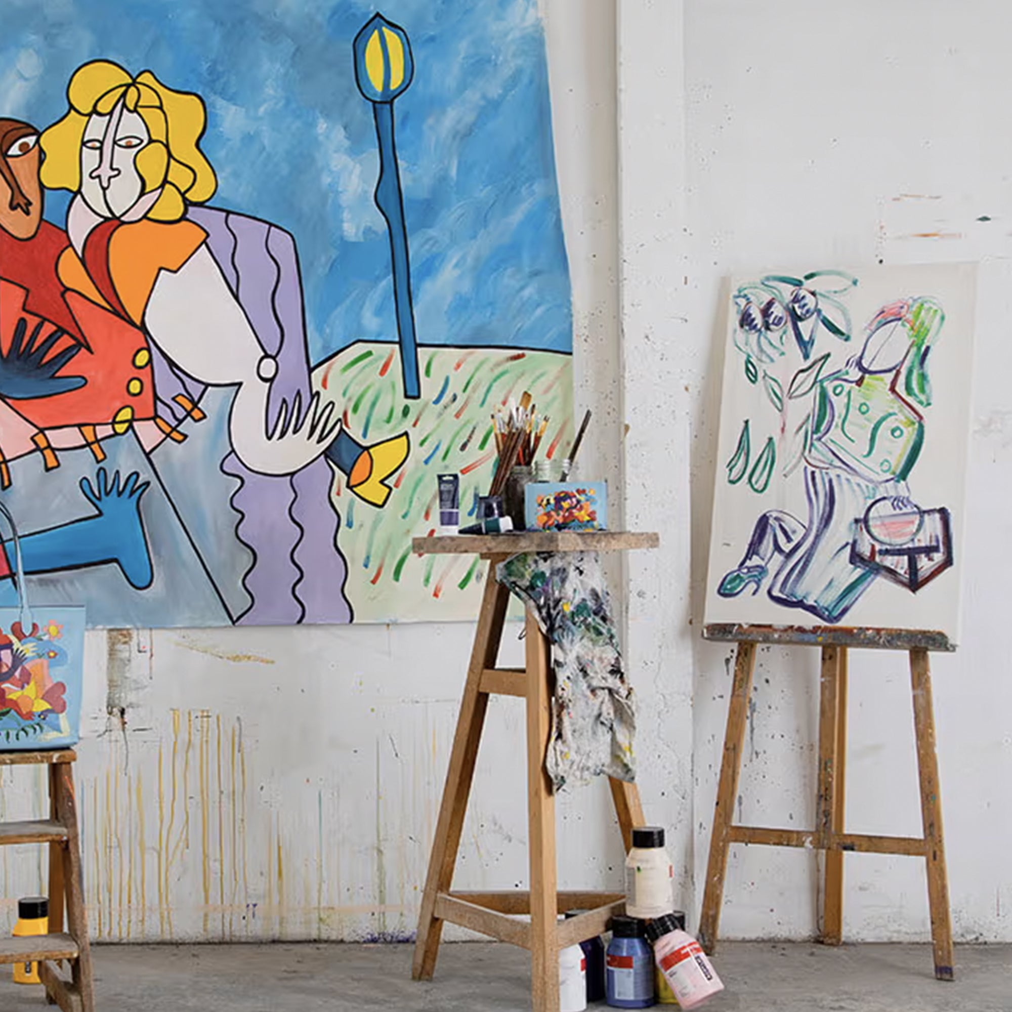 Je pense que son authenticité réside dans un jeu de couleurs contrastées, avec des lignes noires qui viennent entourer ce que je mets en forme. J’ai aussi une certaine liberté dans la manière de former mes personnages, mes objets, mes formes, mes perspectives. Je pense que c’est cela qui définit ma particularité. Sinon, je travaille toujours de la peinture acrylique et parfois de la peinture à l’huile.