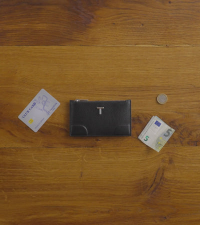 Kartenetui mit Reißverschluss, Branding „Le Tanneur” und silbernem Signatur-T. Integrierter RFID-Schutz.