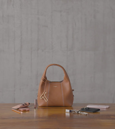 Diese kleine, weiche Handtasche aus Glattleder und mit Linien ohne Passe hat einen hellgoldenen T-Anhänger als Signatur. Wird am abnehmbaren Riemen in der Hand, über der Schulter oder umgehängt getragen.