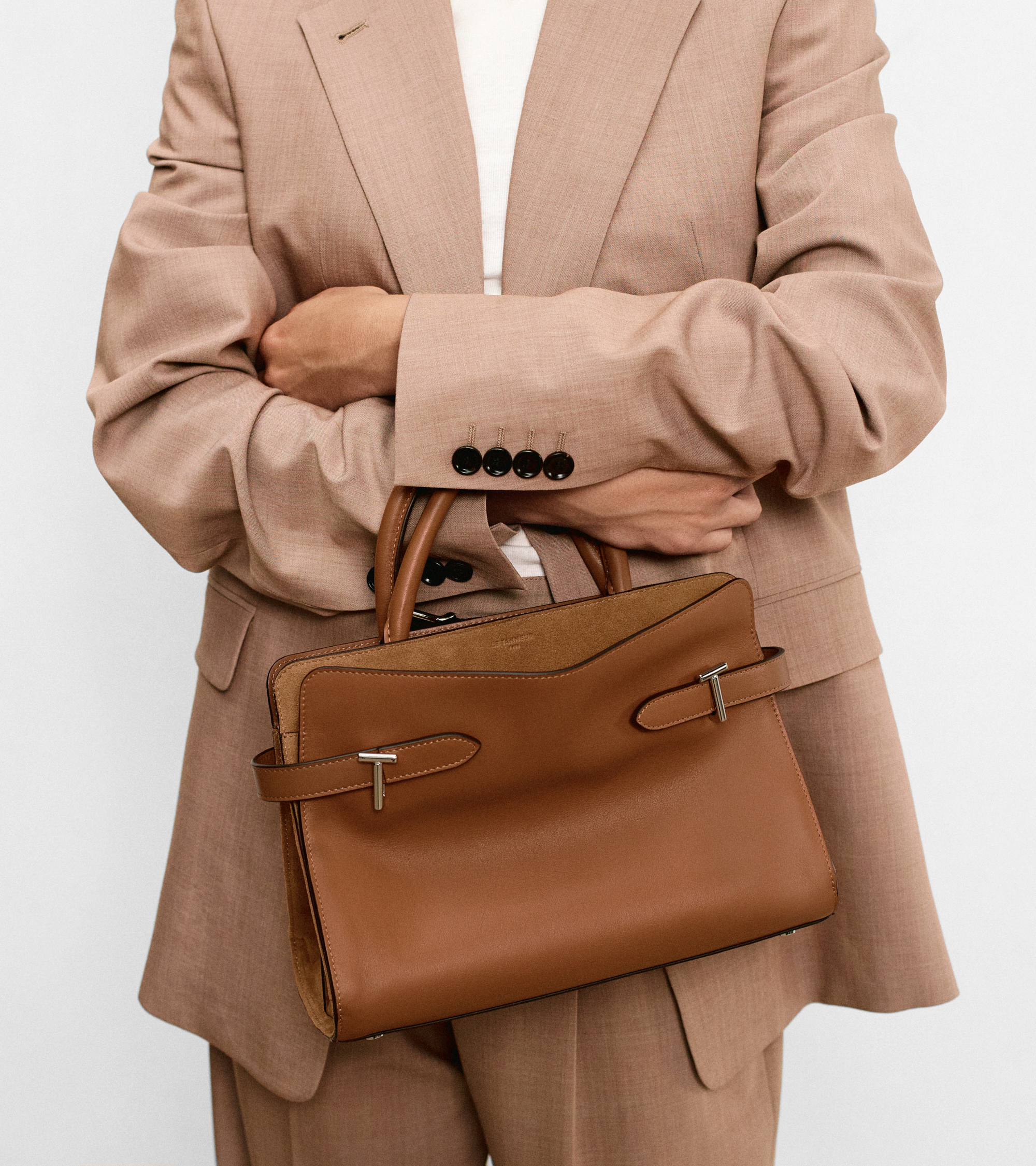Two-material handbag with signature T clasps, toron handles and tone-on-tone embossed Le Tanneur logo. Carried by hand, over the shoulder or across the body with its adjustable and detachable shoulder strap.