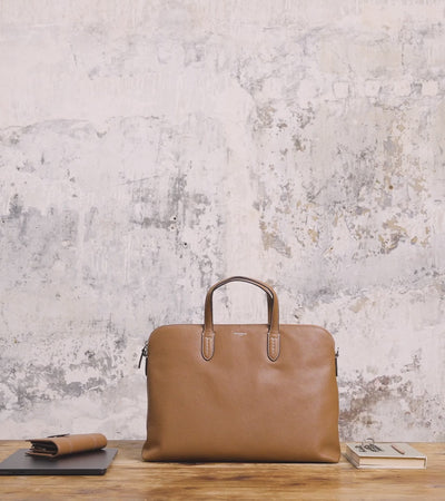 Briefcase with T-stitched ribbed handles and Le Tanneur marking in silver finish. Carried by hand, cross body or on the shoulder thanks to its adjustable and removable shoulder strap. Can accommodate a 15” laptop.