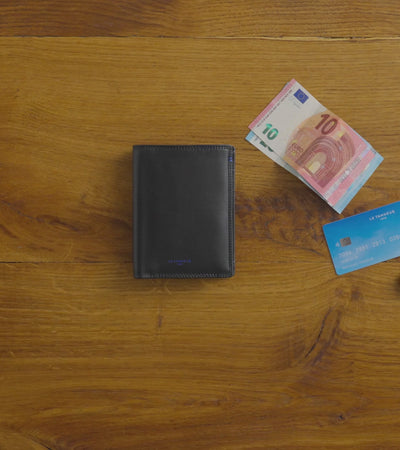 Esta cartera mediana vertical presenta un marcado Le Tanneur discreto de color Le Bleu, así como un punto doble del mismo contraste cosido a mano.